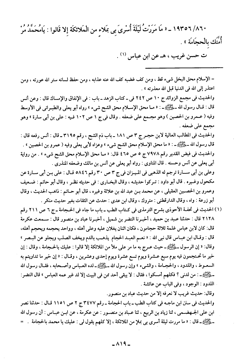 860/ 19356 - "مَا مَرَرْتُ لَيلَةَ أُسْرى بِي بمَلاءٍ من الْمَلائكَة إِلا قَالوا: يَا مُحَمَّدُ مُرْ أُمَّتَك بِالْحجَامَة".