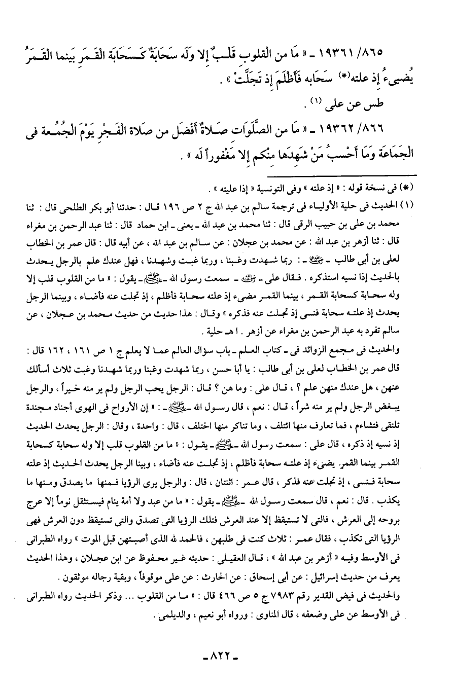 865/ 19361 - "مَا من الْقلوبِ قَلْبٌ إِلا وَلَه سَحَابَةٌ كَسَحَابَة الْقَمَرِ بَينما الْقَمَرُ يُضيئُ إِذ علته (*) سَحَابه فَأَظْلَمَ إِذ تَجَلَّتْ".