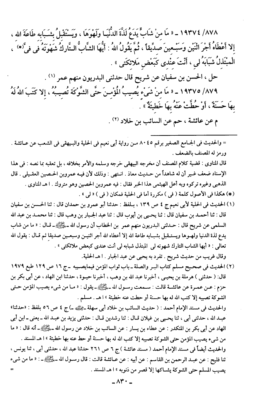 (¬1) الحديث في الحلية لأبي نعيم ج 4 ص 139، بلفظ: حدثنا أبو عمرو بن حمدان قال: ثنا الحسن بن سفيان قال: ثنا أحمد بن سفيان قال: ثنا يحيى بن أيوب قال: ثنا عبد الجبار بن وهب قال: ثنا محمَّد بن عبد الله السلمى عن شريح قال: حدثني البدريون منهم عمر بن الخطّاب أن رسول الله - صلى الله عليه وسلم - قال: "ما من شاب يدع لذة الدنيا ولهوها ويستقبل بشبابه طاعة الله إلا أعطاه الله أجر اثنين وسبعين صديقا ثمَّ قال: يقول الله تعالى: "أيها الشاب التارك شهوته لي المبتذل شبابه لي أنت عندي كبعض ملائكتى".