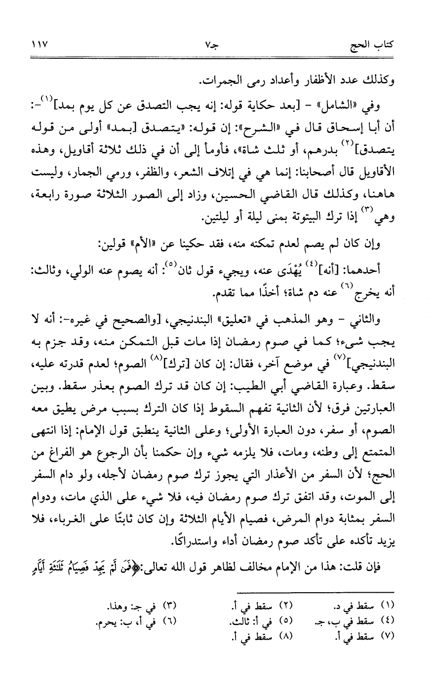وفي "الشامل" -[بعد حكاية قوله: إنه يجب التصدق عن كل يوم بمد]-: أن أبا إسحاق قال في "الشرح": إن قوله "يتصدق [بمد" أولى من قوله يتصدق] بدرهم، أو ثلث شاة"، فأومأ إلى أن في ذلك ثلاثة أقأويل، وهذه الأقاويل قال أصحابنا: إنما هي في إتلاف الشعر، والظفر، ورمي الجمار، وليست هاهنا، وكذلك قال القاضي الحسين، وزاد إلى الصور الثلاثة صورة رابعة، وهي إذا ترك البيتوتة بمنى ليلة أو ليلتين.