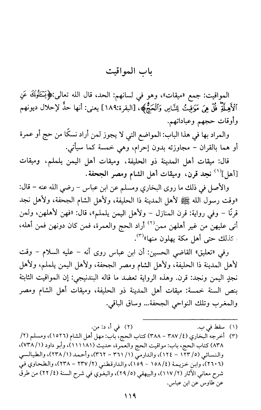 قال: ميقات أهل المدينة ذو الحليفة، وميقات أهل اليمن يلملم، وميقات [أهل] نجد قرن، وميقات أهل الشام ومصر الجحفة.