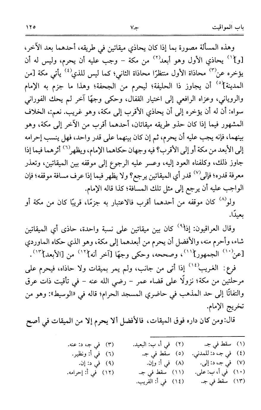 وهذه المسألة مصورة بما إذا كان يحاذي ميقاتين فى طريقه، أحدهما بعد الآخر، [و]، يحاذي الأول وهو أبعد من مكة- وجب عليه أن يحرم، وليس له أن يؤخره عن محاذاة الأول منتظراً محاذاة الثاني؛ كما ليس للذي يأتي مكة [من المدينة]، أن يجاوز ذا الحليفة؛ ليحرم من الجحفة؛ وهذا ما جزم به الإمام والروياني، وعزاه الرافعي إلى اختيار القفال، وحكى وجهاً آخر لم يحك النوراني سواه: أن له أن يؤخره إلى أن يحاذي الأقرب إلى مكة، وهو غريب. نعم:، الخلاف المشهور فيما إذا كان حذو طريقه ميقاتان، أحدهما أقرب من الآخر إلى مكة، وهو بينهما، فإنه يجب عليه أن يحرم، ثم إن كان بينهما على قدر واحد، فهل ينسب إحرامه إلى الأبعد من مكة أو إلى الأقرب؟ فيه وجهان حكاهما الإمام، ويظهر أثرهما فيما إذا جاوز ذلك، وكلفناه العود إليه، وعسر عليه الرجوع إلى موقفه يين الميقاتين، وتعذر معرفة قدره؛ فإلى قدر أي الميقاتين يرجع؟ ولا يظهر فيما إذا عرف مسافة موقفه؛ فإن الواجب عليه أن يرجع إلى مثل تلك المسافة؛ كذا قاله الإمام.