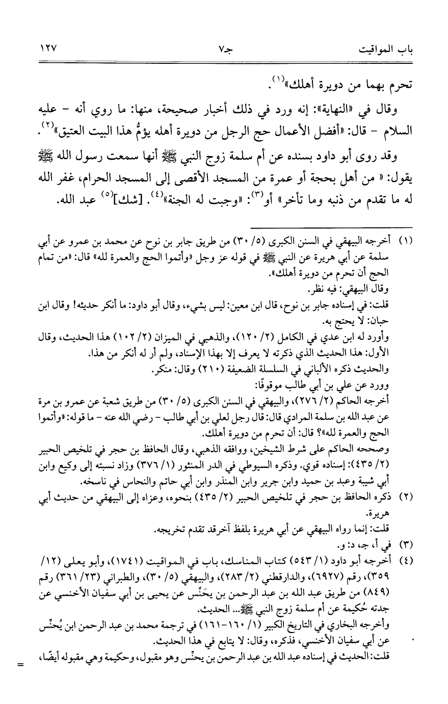 وقال في "النهاية": إنه ورد في ذلك أخبار صحيحة، منها: ما روي أنه - عليه السلام – قال: "أفضل الأعمال حج الرجل من دويرة أهله يؤمُّ هذا البيت العتيق".