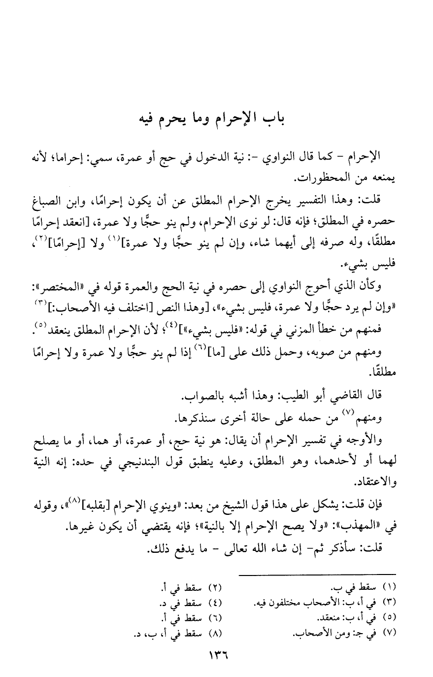 والأوجه في تفسير الإحرام أن يقال: هو نية حج، أو عمرة، أو هما، أو ما يصلح لهما أو لأحدهما، وهو المطلق، وعليه ينطبق قول البندنيجى فى حده: إنه النية والاعتقاد.