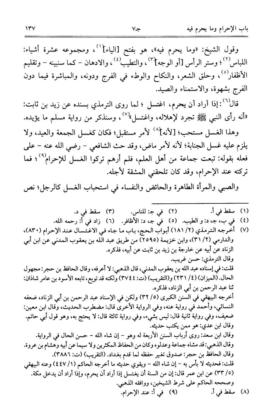 قال: إذا أراد أن يحرم، اغتسل؛ لما روى الترمذي بسنده عن زيد بن ثابت: "أنه رأى النبي صلى الله عليه وسلم تجرد لإهلاله، واغتسل"، وسنذكر من رواية مسلم ما يؤيده.