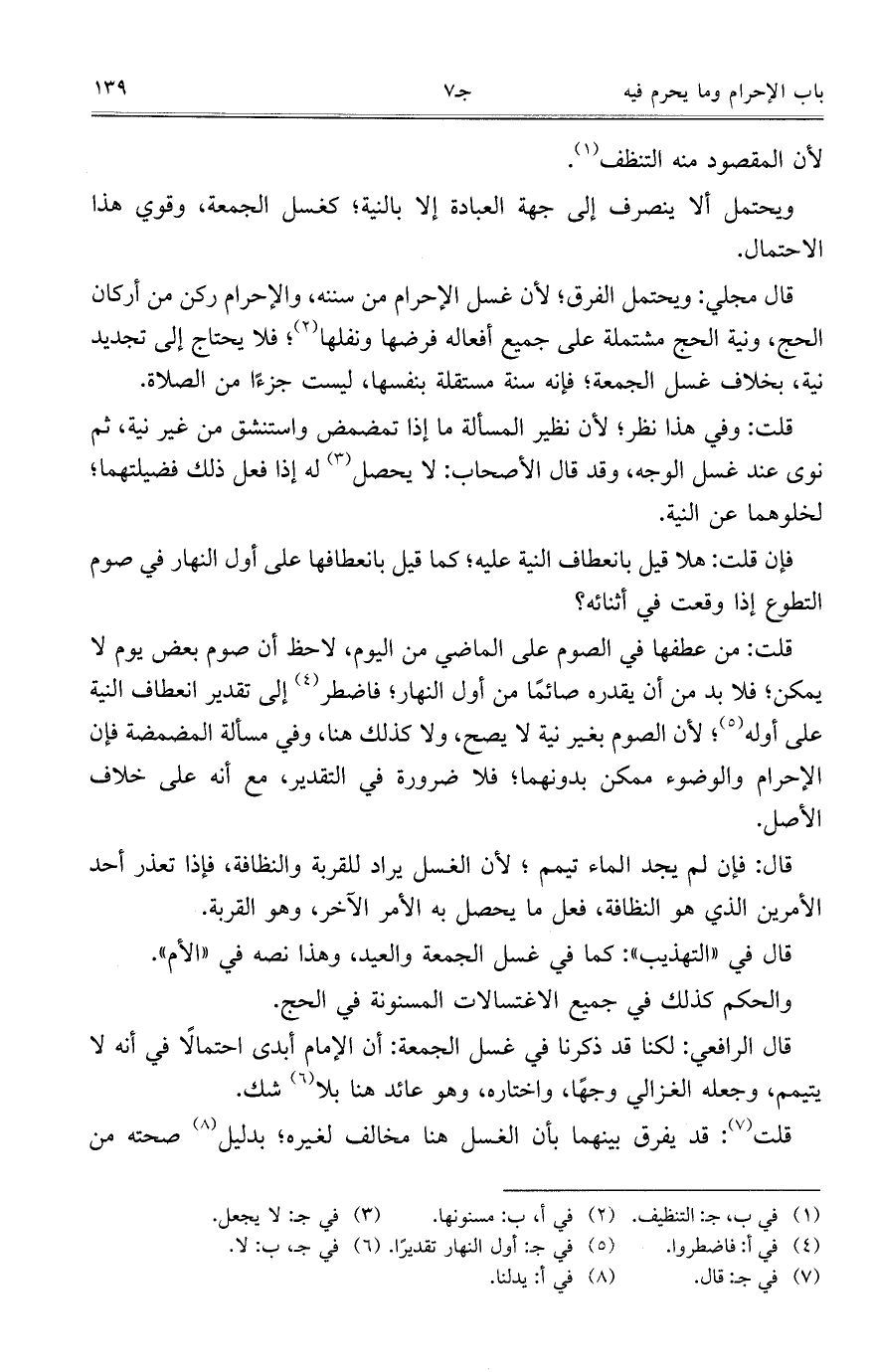 قال مجلي: ويحتمل الفرق؛ لأن غسل الإحرام من سننه، والإحرام ركن من أركان الحج، ونية الحج مشتملة على جمح أفعاله فرضها ونفلها؛ فلا يحتاج إلى تجديد تية، بخلاف غسل الجمعة؛ فإنه سنة مستقلة بنفسها، ليست جزءاً من الصلاة.