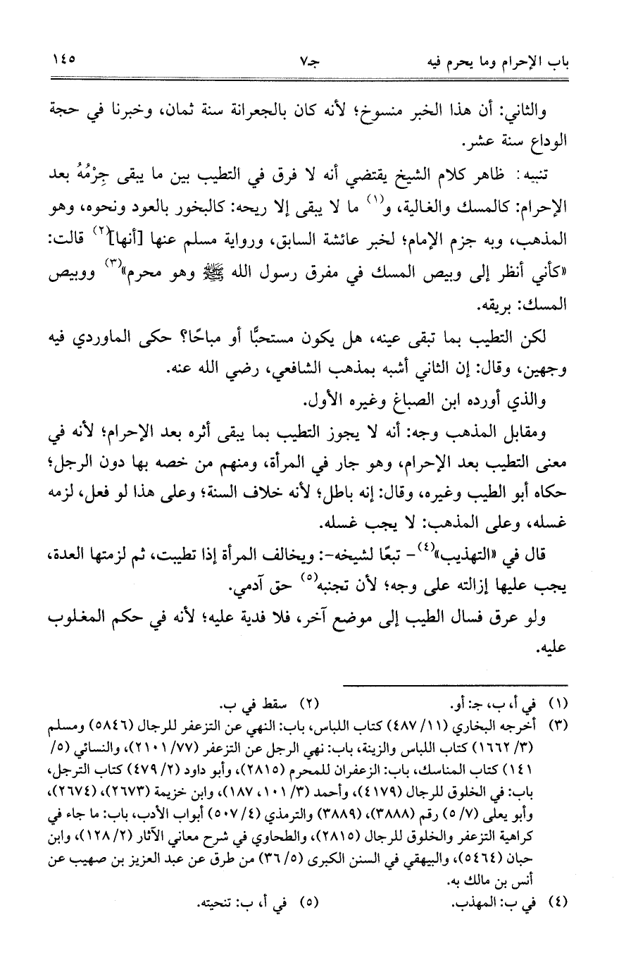 تنبيه: ظاهر كلام الشيخ يقتضي أنه لا فرق في التطيب بين ما يبقى جِرْمُهُ بعد الإحرام؛ كالمسك والغالية، وما لا يبقى إلا ريحه: كالبخور بالعود ونحوه، وهو المذهب، وبه جزم الإمام؛ لخبر عائشة السابق، ورواية مسلم عنها [أنها] قالت: "كأني أنظر إلى وبيص المسك في مفرق رسول الله صلى الله عليه وسلم وهو محرم" ووبيص المسك: بريقه.