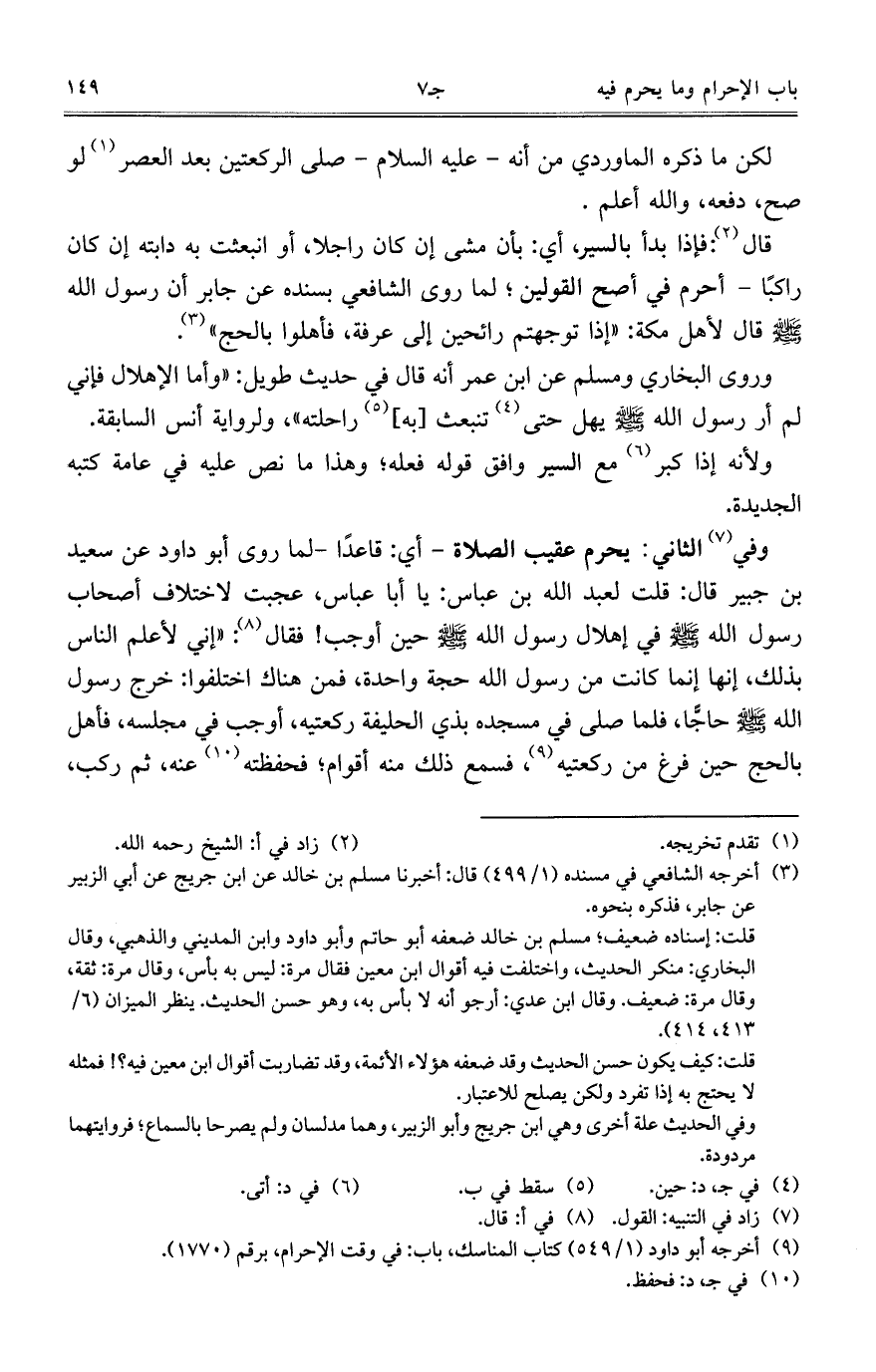 قال: فإذا بدأ بالسير، أي: بأن مشى إن كان راجلاً، أو انبعثت به دابته إن كان راكباً - أحرم في أصح القولين؛ لما روى الشافعي سنده عن جابر أن رسول الله صلى الله عليه وسلم قال لأهل مكة: "إذا توجهتم رائحين إلى عرفة، فأهلوا بالحج".