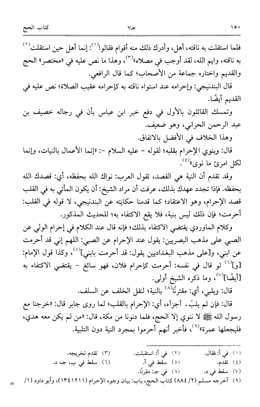 قال اليندنيجي: وإحرامه عند استواء ناقته يه كإحرامه عقيب الصلاة؛ نص عليه فى لقديم أيضاً.