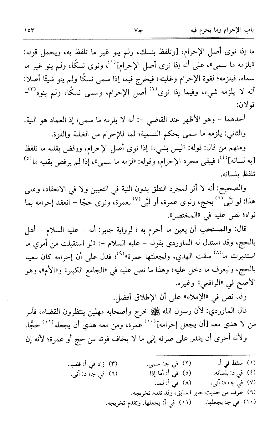 قال: والمستحب أن يعين ما أحرم به؛ لرواية جابر: أنه - عليه السلام - أهل بالحج، وقد استدل له الماوردي بقوله -عليه السلام-: "لو استقبلت من أمري ما استدبرت ما سقت الهدي، ولجعلتها عمرة"؛ فدل على أن إحرامه كان معيناً بالحج، وليعرف ما دخل عليه؛ وهذا ما نص عليه في "الجامع الكبير" و"الأم"، وهو الأصح في "الرافعي" وغيره.