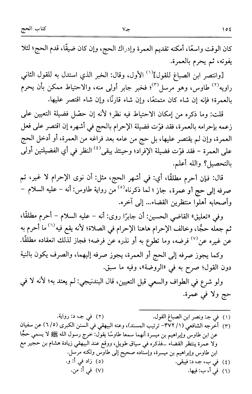 [وانتصر ابن الصباغ للقول] الأول، وقال: الخبر الذي استدل به للقول الثاني رأويه طأوس، وهو مرسل؛ فخبر جابر أولى منه، والاحتياط ممكن بأن يحرم بالعمرة؛ فإنه إن شاء كان متمتعاً، وإن شاء قارناً، وإن شاء اقتصر عليها.