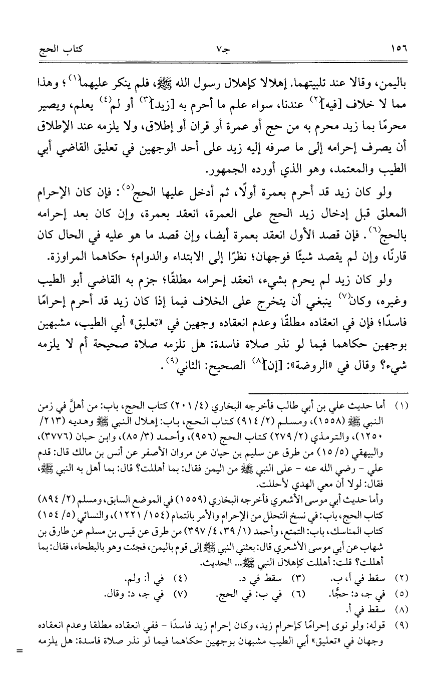 باليمن، وقالا عند تلبيتهما. إهلالا كإهلال رسول الله صلى الله عليه وسلم، فلم ينكر عليهما؛ وهذا مما لا خلاف [فيها] عندنا، سواء علم ما أحرم به [زيد] أو لم يعلم، ويصير محرما بما زيد محرم به من حج أو عمرة أو قران أو إطلاق، ولا يلزمه عند الإطلاق أن يصرف إحرامه إلى ما صرفه إليه زيد على أحد الوجهين في تعليق القاضي أبي الطيب والمعتمد، وهو الذي أورده الجمهور.