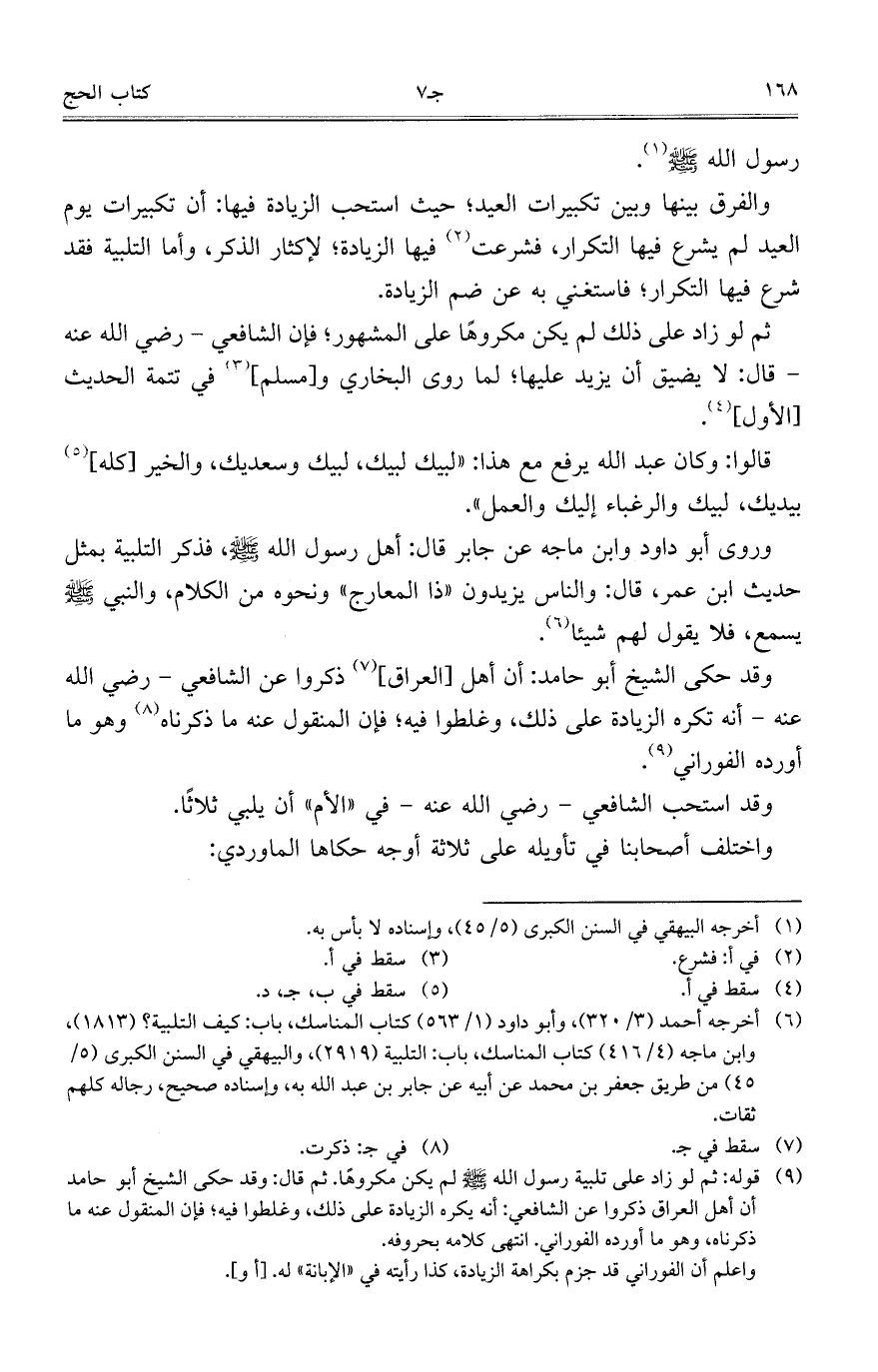 والفرق بينها وبين تكبيرات العيد؛ حيث استحب الزيادة فيها: أن تكبيرات يوم العيد لم يشرع فيها التكرار، فشرعت فيها الزيادة؛ لإكثار الذكر، وأما التلبية فقد شرع فيها التكرار؛ فاستغني به عن ضم الزيادة.