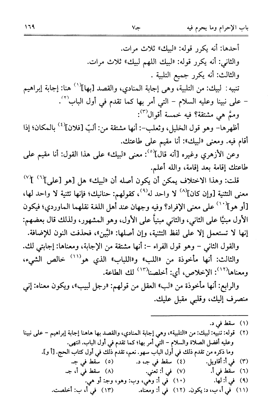 تنبيه: لبيك: من التلبية، وهى إجابة المنادي، والقصد [بها] هنا: إجابة إبراهيم - على نبينا وعليه السلام - التي أمر بها كما تقدم في أول الباب.