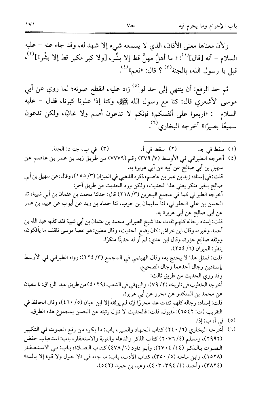 ثم حد الرفع: أن يتتهي إلى حد لو زاد عليه، انقطع صوته؛ لما روي عن أبي موسى الأشعري قال: كنا مع رسول الله صلى الله عليه وسلم، وكنا إذا علونا كبرنا، فقال – عليه السلام -: "اربعوا على أنفسكم؛ فإنكم لا تدعون أصم ولا غائباً، ولكن تدعون سميعاً بصيراً" أخرجه البخاري.