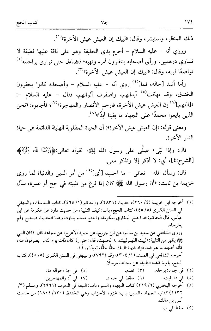 وروي أنه - عليه السلام - أحرم بذى الحليفة وهو على ناقة عليها قطيفة لا تساوي درهمين، ورأى أصحابه يتتظرون أمره ونهيه؛ فتضاءل حتى توارى براحلته تواضعاً لربه، وقال: "لبيك إن العيش عيش الآخرة".