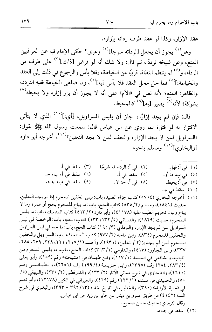 وهل يجوز أن يجعل [لردائه سرجاً] وعرى؟ حكى الإمام فيه عن العراقيين المنع، وعن شيخه تردداً، ثم قال: ولا شك أنه لو فرض [ذلك] على طرف من الرداء، ولم ينتظم انتظاماً قريباً من الخياطة، [فلا بأس والرجوع في ذلك إلى العقد والخياطة:] فما حل محل العقد فلا بأس [به]، وما ضاهى الخياطة ففيه التردد، والظاهر: المنع؛ لأنه نص في "الأم" على أنه لا يجوز أن يزر إزاره ولا يخيطه بشوكة؛ لأنه يصير [به] كالمنعيط.