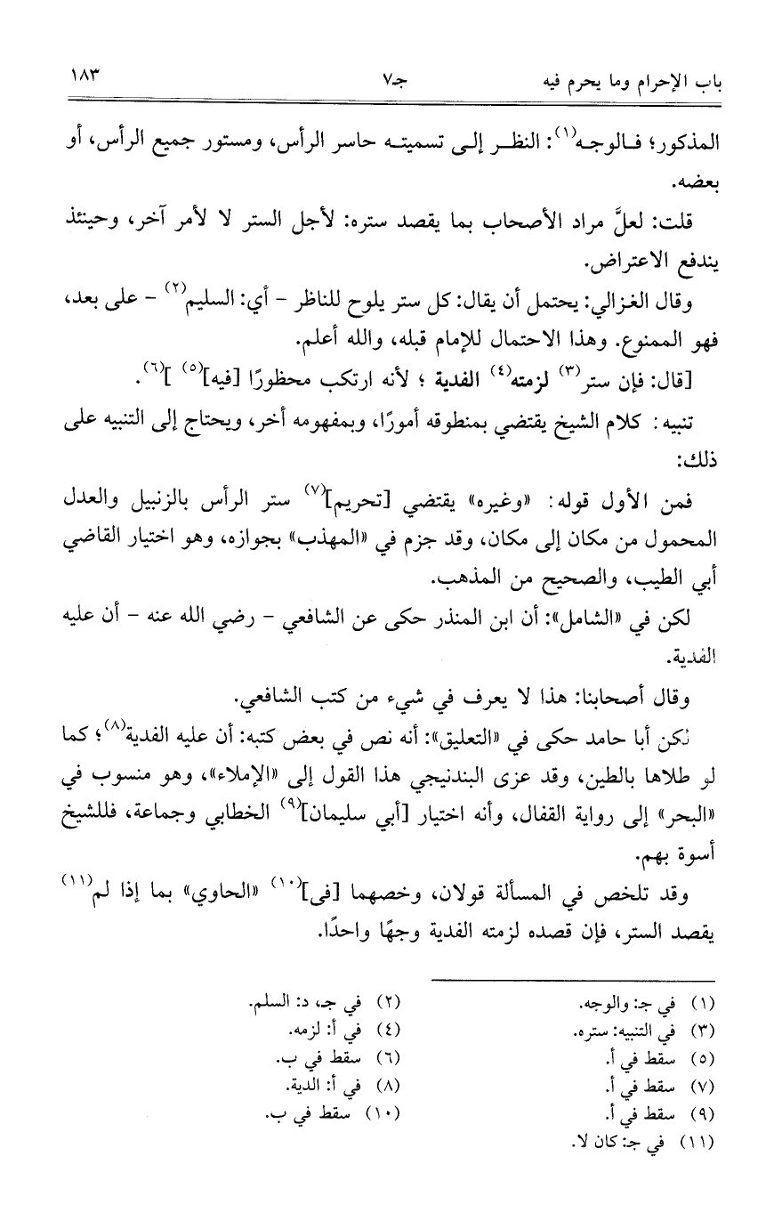لكن أبا حامد حكى فى "التعليق": أنه نص فى بعض كتبه: أن عليه الفدية؛ كما لو طلاها بالطين، وقد عزى البندنيجى هذا القول إلى "الإملاء"، وهو منسوب في "البحر" إلى رواية القفال، وأنه اختيار [أبي سليمان] الخطابي وجماعة، فللشيخ أسوة بهم.