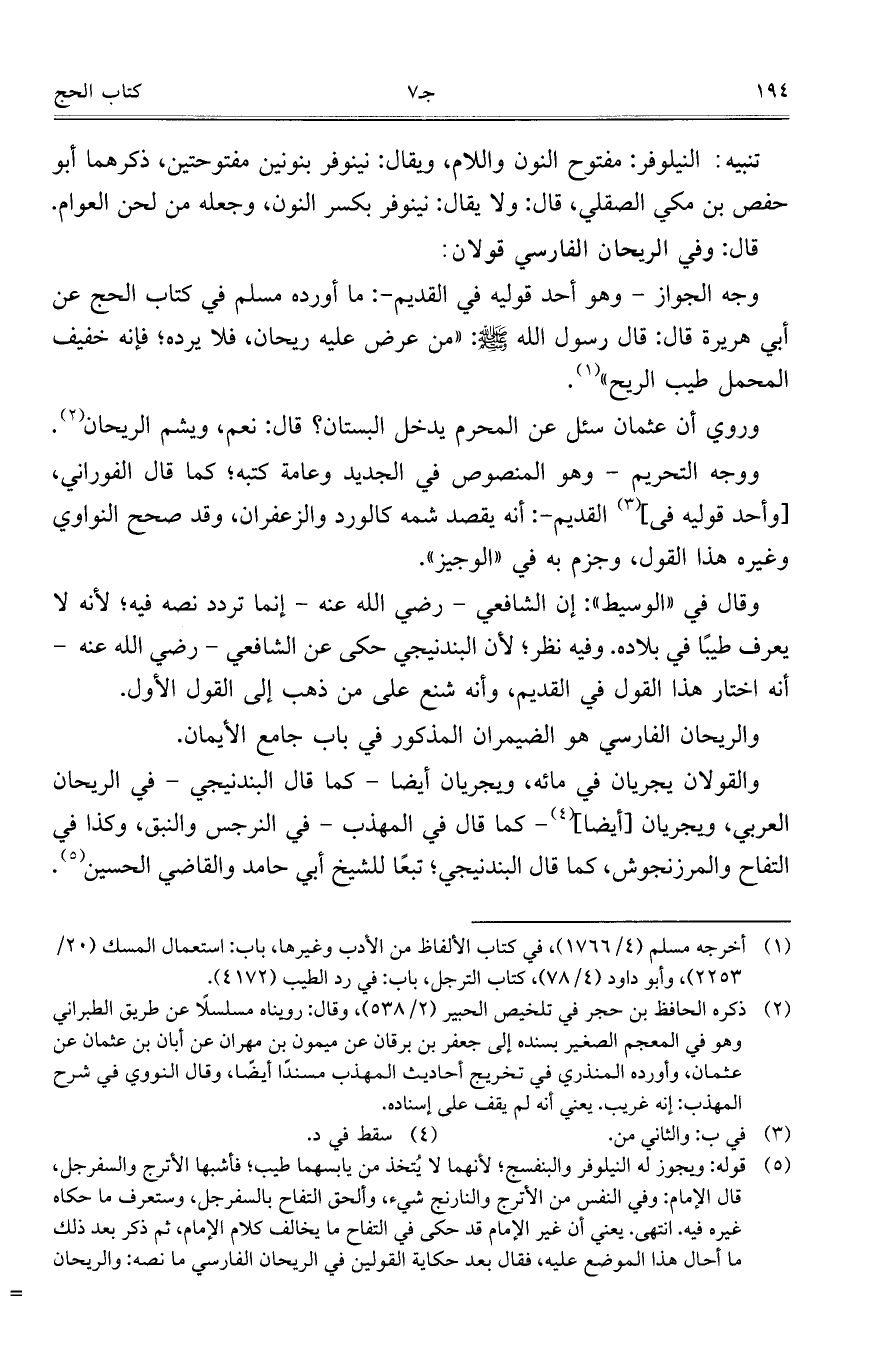 والقولان يجريان في مائه، ويجريان أيضاً- كما قال البندنيجي- في الريحان العربي، ويجريان [أيضاً]- كما قال في المهذب - في النرجس والنبق، وكذا في التفاح والمرزنجوش، كما قال البندنيجي؛ تبعًا للشيخ أبي حامد والقاضي الحسين.
