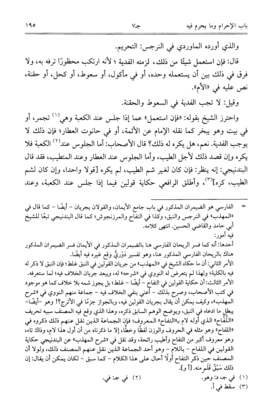 واحترز الشيخ بقوله: "فإن استعمل" عما إذا جلس عند الكعبة وهي تجمر، أو في بيت وهو يبخر كما نقله الإمام عن الأئمة، أو في حانوت العطار؛ فإن ذلك لا يوجب الفدية. نعم، هل يكره له ذلك؟ قال الأصحاب: أما الجلوس عند، الكعبة فلا يكره وإن قصد ذلك لأجل الطيب، وأما الجلوس عند العطار وعند المتطيب، فقد قال البندنيجي: إنه ينظر: فإن كان لغير شم الطيب، لم يكره [قولاً واحداً، وإن كان لشم الطيب، كره]، وأطلق الرافعي حكاية قولين فيما إذا جلس عند الكعبة، وعند