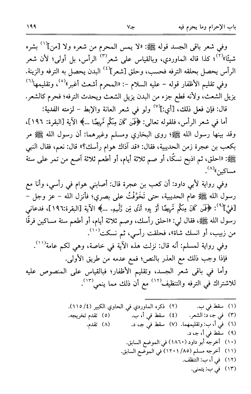 وفي شعر باقى الجسد قوله صلى الله عليه وسلم: "لا يمس المحرم من شعره ولا [من] بشره شيئاً؛ كذا قاله الماوردي، وبالقياس على شعر الرأس، بل أولى؛ لأن شعر الرأس يحصل بحلقه الترفه فحسب، وحلق [شعر] البدن يحصل به الترفه والزينة.