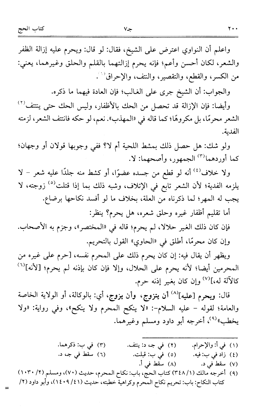 واعلم أن النواوي اعترض على الشيخ، فقال: لو قال: ويحرم عليه إزالة الظفر والشعر، لكان أحسن وأعلم؛ فإنه يحرم إزالتهما بالقلم والحلق وغيرهما، يعني من الكسر، والقطع، والتقصير، والنتف والإحراق.