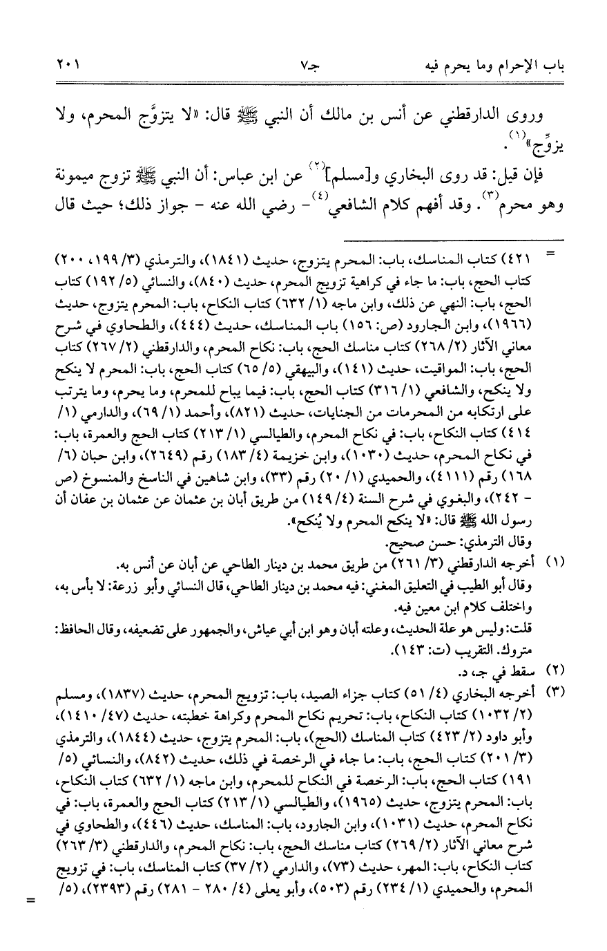 فإن قيل: قد روى البخاري و [مسلم] عن ابن عباس: أن النبي صلى الله عليه وسلم تزوج ميمونة وهو محرم. وقد أفهم كلام الشافعي –رضي الله عنه- جواز ذلك؛ حيث قال
