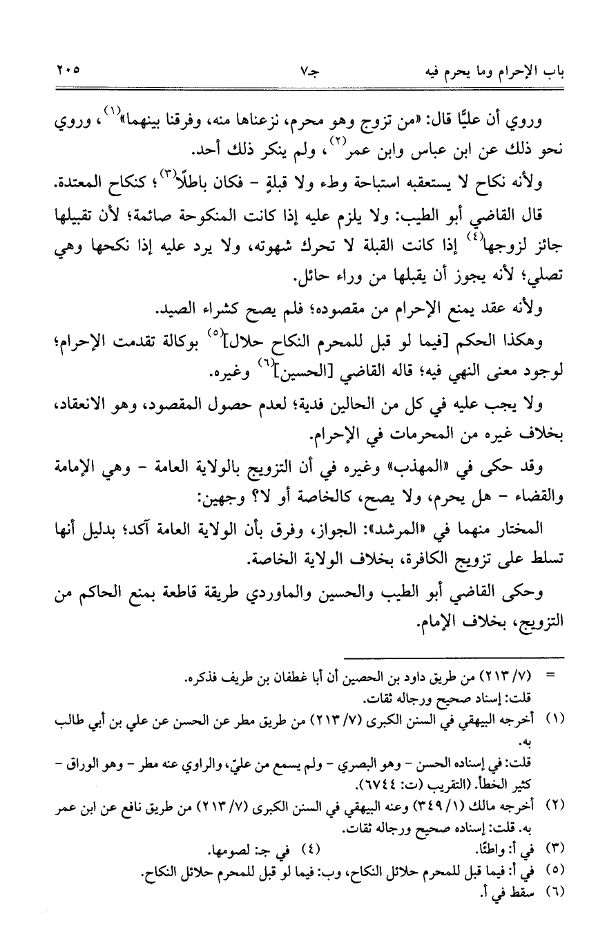 وروي أن عليا قال: "من تزود وهو محرم، نزعناها منه، وفرقنا بينهما"، وروي نحو ذلك عن ابن عباس وابن عمر، ولم ينكر ذلك أحد.