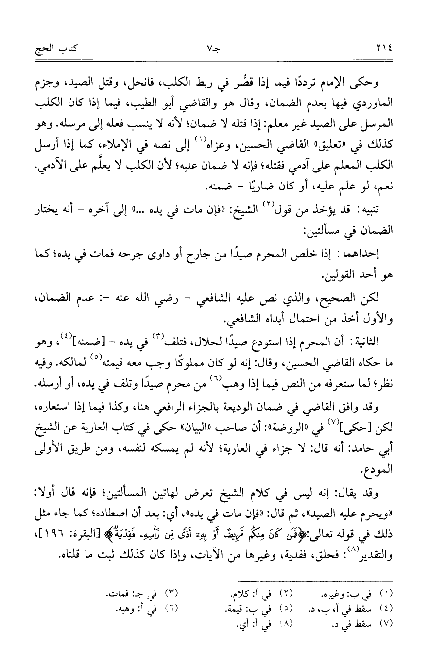 وقد يقال: إنه ليس في كلام الشيخ تعرض لهاتين المسألتين؛ فإنه قال أولا: "ويحرم عليه الصيد"، ثم قال: "فإن مات في يده"، أي: بعد أن اصطاده؛ كما جاء مثل ذلك في قوله تعالى: {فَمَنْ كَانَ مِنْكُمْ مَرِيضًا أَوْ بِهِ أَذًى مِنْ رَاسِهِ فَفِدْيَةٌ} [البقرة: 196]، والتقدير: فحلق، ففدية، وغيرها من الآيات، وإذا كان كذلك ثبت ما قلناه.