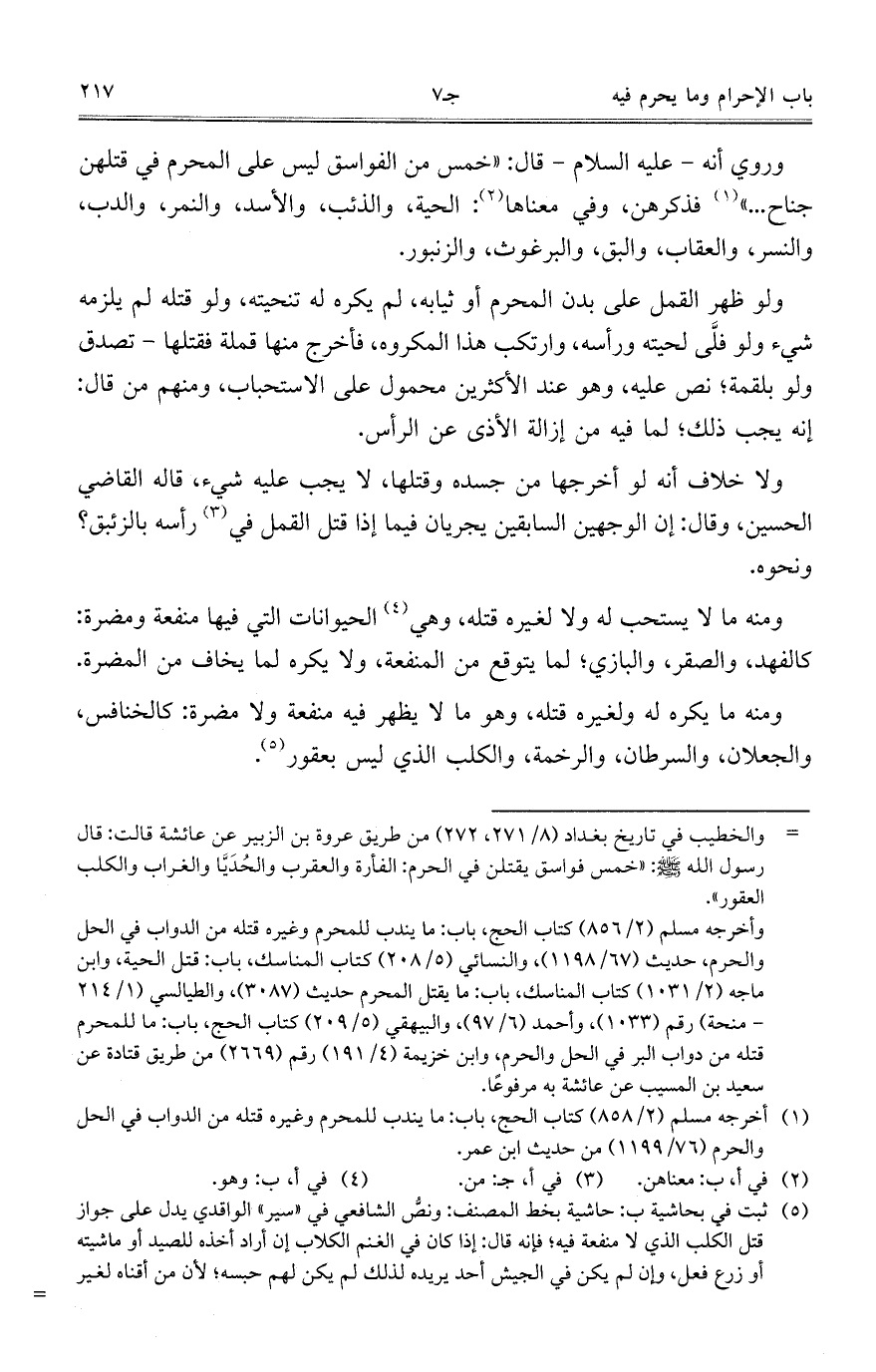 وروي أنه –عليه السلام- قال: "خمس من الفواسق ليس على المحرك في قتلهن جناح .... " فذكرهن، وفي معناها: الحية، والذئب، والأسد، والنمر، والدب، والنسر، والعقاب، والبق، والبرغوث، والزنبور.