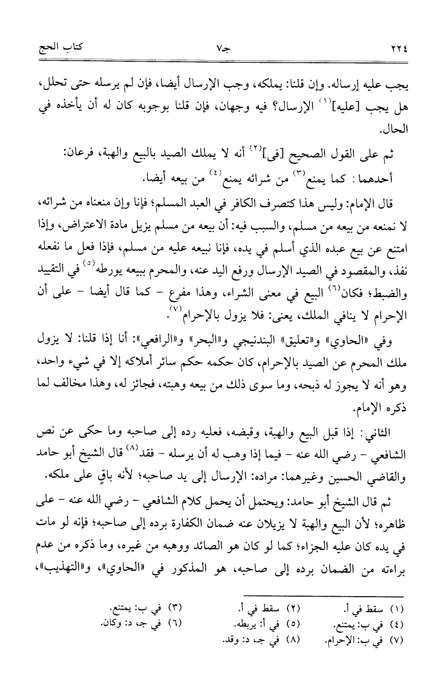 قال الإمام: وليس هذا كتصرف الكافر في العبد المسلم؛ فإنا وإن منعناه من شرائه، لا نمنعه من بيعه من مسلم، والسبب فيه: أن بيعه من مسلم يزيل مادة الاعتراض، وإذا امتنع عن بيع عبده الذي أسلم في يده، فإنا نبيعه عليه من مسلم، فإن فعل ما نفعله نفذ، والمقصود في الصيد الإرسال ورفع اليد عنه، والمحرم ببيعه يورطه في التقييد والضبط؛ فكان البيع في معنى الشراء، وهذا مفرع -كما قال أيضاً- على أن الإحرام لا ينافي الملك، يعنى: فلا يزول بالإحرام.