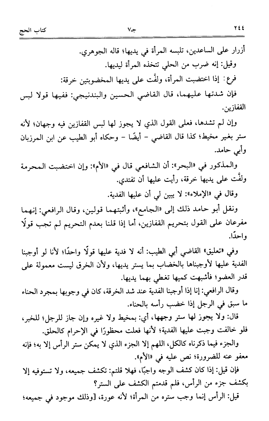 والمذكور في "البحر": أن الشافعي قال في "الأم": وإن اختضبت المحرمة ولفَّت على يديها خرقة، رأيت علها أن تفتدي.