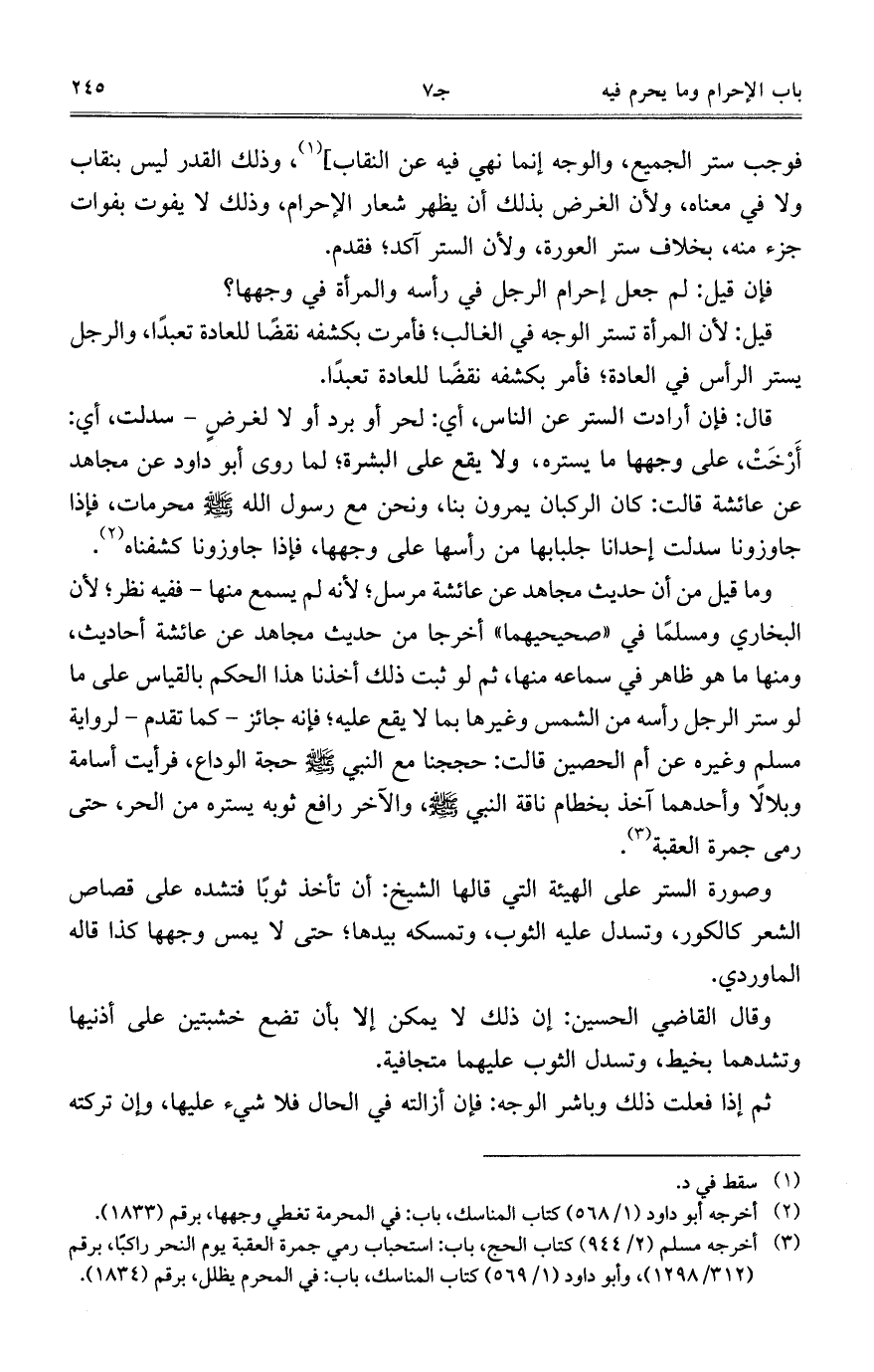 قال: فإن أرادت الستر عن الناس، أي لحر أو برد أو لا لغرضٍ – سدلت، أي: أَزْخَتْ، على وجهها ما يستره، ولا يقع على البشرة؛ لما روى أبو داود عن مجاهد عن عائشة قالت: كان الركبان يمرون بنا، ونحن مع رسول الله صلى الله عليه وسلم محرمات، فإذا جاوزونا سدلت إحدانا جلبابها من رأسها على وجهها، فإذا جاوزونا كشفناه.