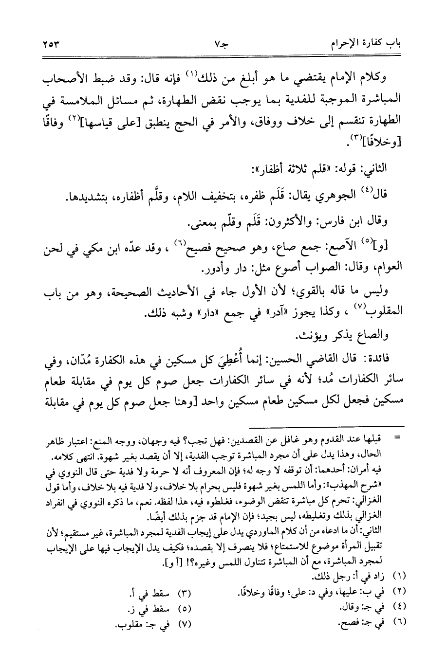وكلام الإمام يقتضي ما هو أبلغ من ذلك فإنه قال: وقد ضبط الأصحاب المباشرة الموجبة للفدية بما يوجب نقض الطهارة، ثم مسائل الملامسة في الطهارة تنقسم إلى خلاف ووفاق، والأمر في الحج ينطبق [على قياسها] وفاقاً [وخلافًا].