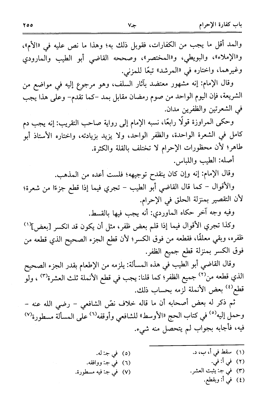 وقال الإمام: إنه مشهور معتضد بآثار السلف، وهو مرجوع إليه في مواضع من الشريعة، فإن اليوم الواحد من صوم رمضان مقابل بمد -كما تقدم- وعلى هذا يجب في الشعرتين والظفرين مدان.