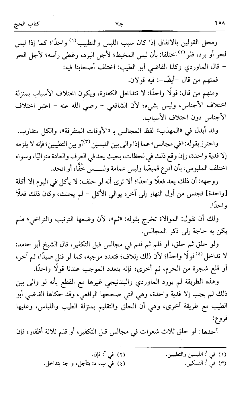 ومحل القولين بالاتفاق إذا كان سبب اللبس والتطييب واحداً؛ كما إذا لبس لحر أو برد، فلو اختلفا: بأن لبس المنعيط؛ لأجل البرد، وغطى رأسه؛ لأجل الحر - قال الماوردي وكذا القاضي أبو الطيب: اختلف أصحابنا فيه: