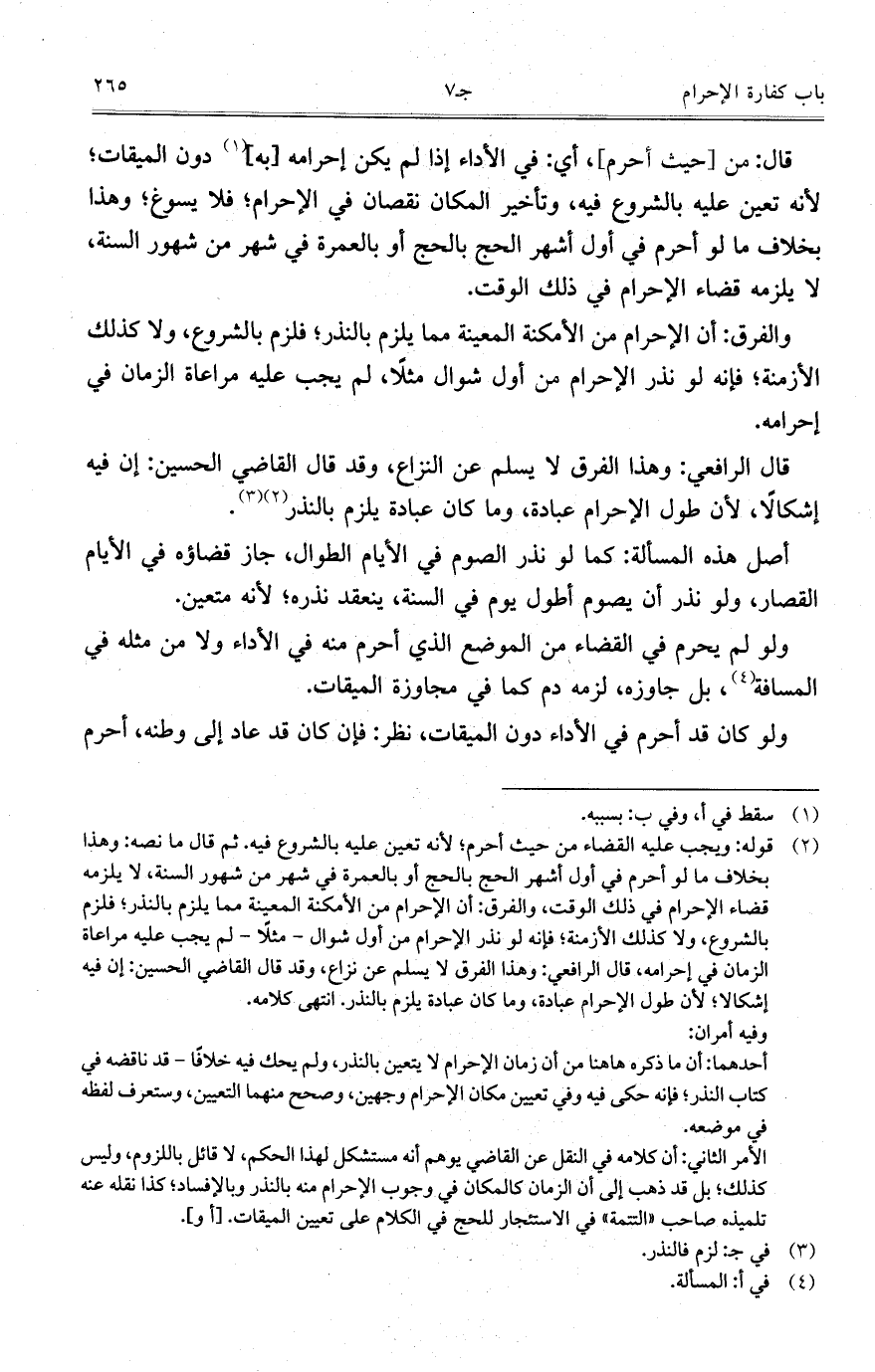 قال الرافعي: وهذا الفرق لا يسلم عن النزاع، وقد قال القاضي الحسين: إن فيه إشكالاً، لأن طول الإحرام عبادة، وما كان عبادة يلزم بالنذر.
