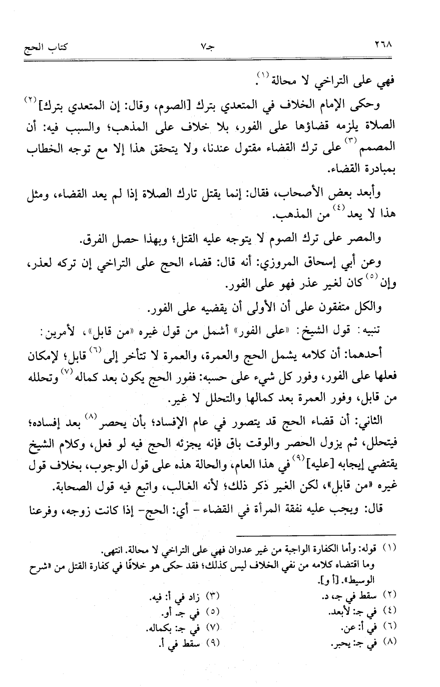 أحدهما: أن كلامه يشمل الحج والعمرة، والعمرة لا تتأخر إلى قابل؛ لإمكان فعلها على الفور، وفور كل شيء على حسبه: ففور الحج يكون بعد كماله وتحلله من قابل، وفور العمرة بعد كمالها والتحلل لا غير.
