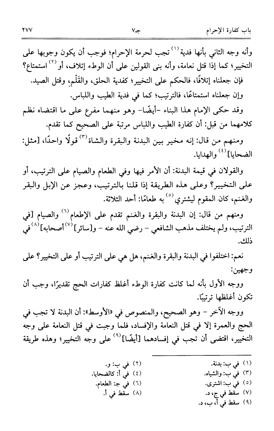 ومنهم من قال: إن البدنة والبقرة والغنم تقدم على الإطعام والصيام [في الترتيب، ولم يختلف مذهب الشافعي- رضي الله عنه – و [سائر] أصحابه] في ذلك.