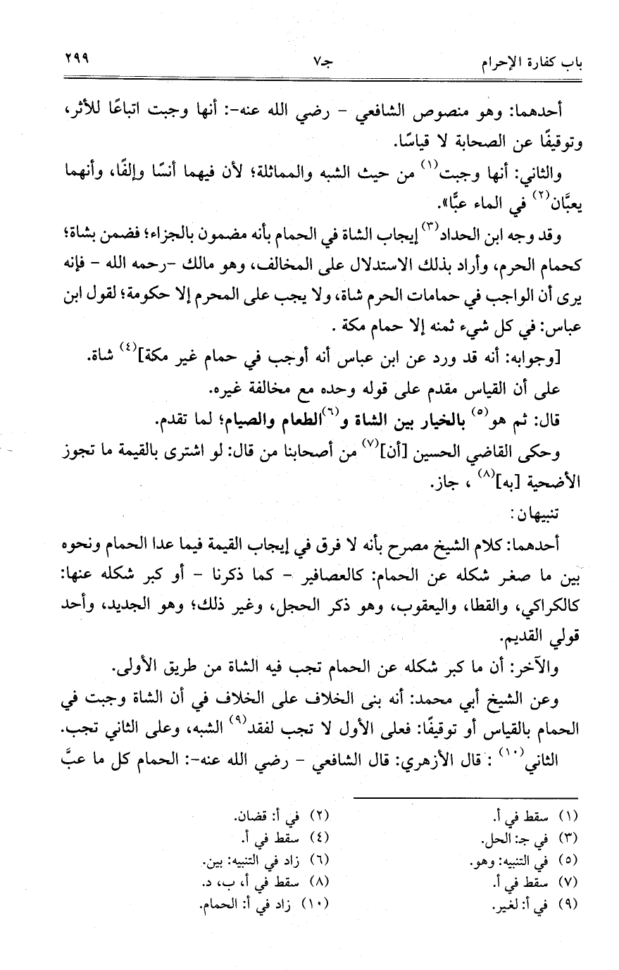 وقد وجه ابن الحداد إيجاب الشاة في الحمام بانه مضمون بالجزاء؛ فضمن بشاة؛ كحمام الحرم, وأراد بذلك الاستدلال علي المنعالف, وهو مالك- رحمه الله- فإنه يرى إن الواجب في حمامات الحرم شاة, ولا يجب علي المحرم إلا حكومة؛ لقول ابن عباس: في كل شيء ثمنه إلا حمام مكة.