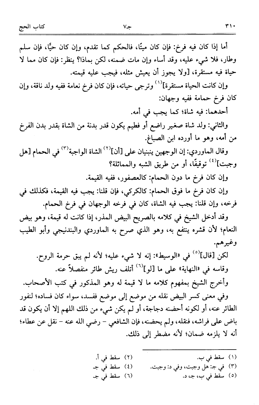 وإن كانت الحياة مستقرة وترجي حياته، فإن كان فرخ نعامة ففيه ولد ناقة، وأنن كان فرخ حمامة ففيه وجهان: