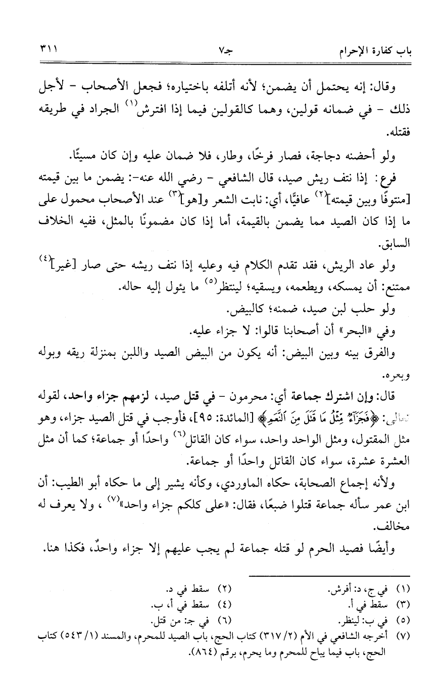 قال: وأن اشترك جماعة أي: محرمون- في قتل صيد، لهزم جزاء واحد، لقوله تعالي: {فَجَزَاءٌ مِثْلُ مَا قَتَلَ مِنَ النَّعَمِ} [المائدة: 95]، فأوجب في قتل الصيد جزاء، وهو مثل المقتول، ومثل الواحد، سواء كان القاتل واحداً أو جماعة؛ كما أن مثل العشرة عشرة، سواء كان القاتل واجداً أو جماعة.
