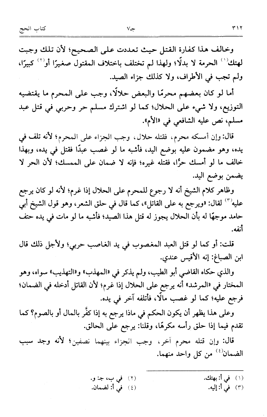 أما لو كان بعضهم محرماً والبعض حلالاً، وجب علي المحرم ما يقتضيه التوزيع، ولا شئ علي الحلال؛ كما لو اشترك مسلم حر وحربي في قتل عبد مسلم، نص عليه الشافعي في " الأم".