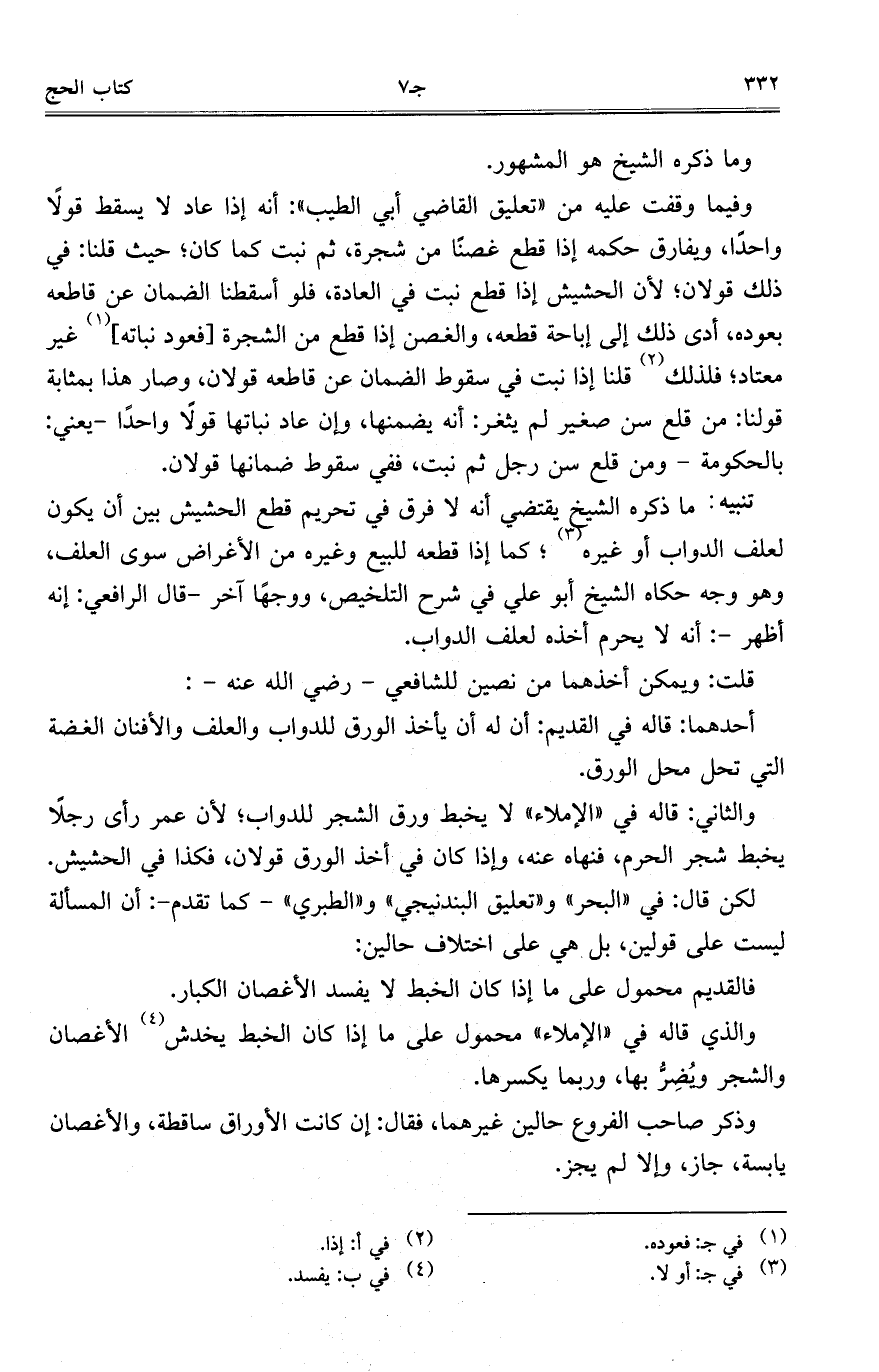 تنبيه: ما ذكره الشيخ يقتضي أنه لا فرق في تحريم قطع الحشيش بين أن يكون لعلف الدواب أو غيره؛ كما إذا قطعه للبيع وغيره من الأغراض سوى العلف, وهو وجه حكاه الشيخ أبو علي في شرح التلخيص, ووجهًا آخر- قال الرافعي: إنه أظهر-: أنه لا يحرم أخذه لعلف الدواب.