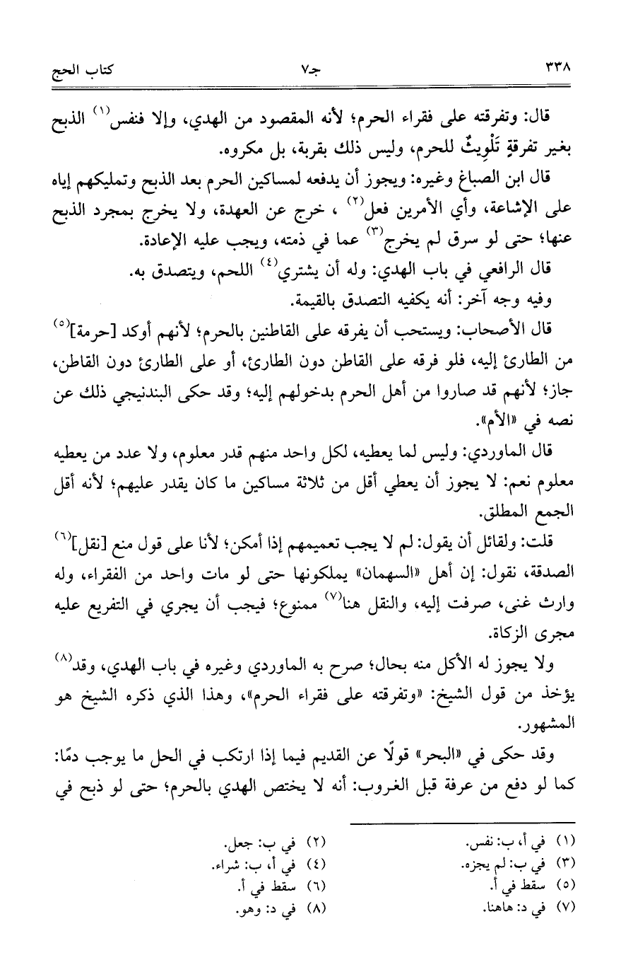 قال: وتفرقته على فقراء الحرم؛ لأنه المقصود من الهدي, وإلا فنفس الذبح بغير تفرقةٍ تَلْوِيثُ للحرم, وليس ذلك بقربة, بل مكروه.
