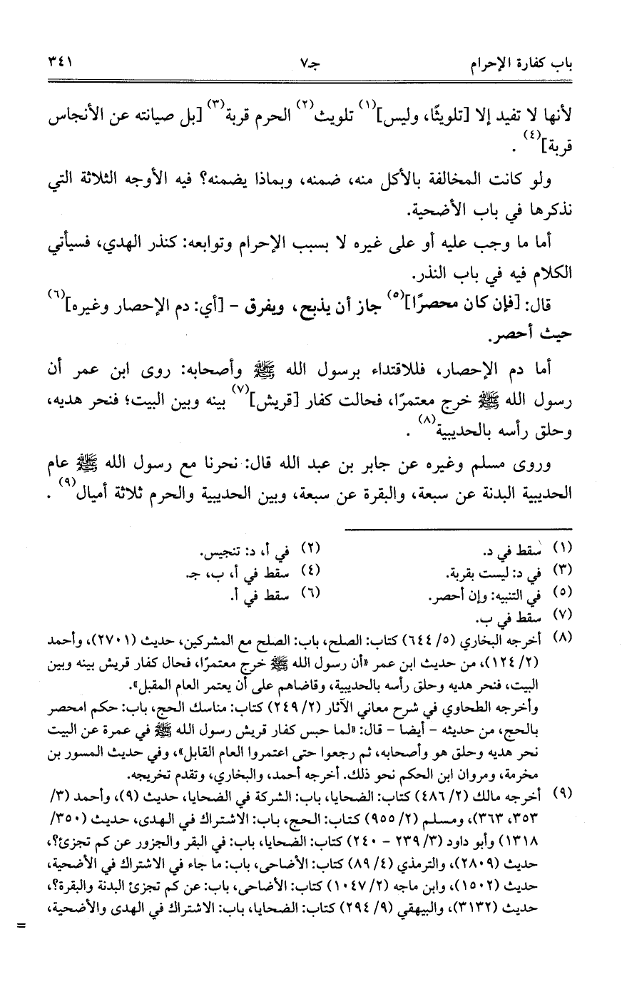 وروى مسلم وغيره عن جابر بن عبد الله قال: نحرنا مع رسول الله- صلى الله عليه وسلم- عام الحديبية البدنة عن سبعة, والبقرة عن سبعة, وبين الحديبية والحرم ثلاثة أميال.