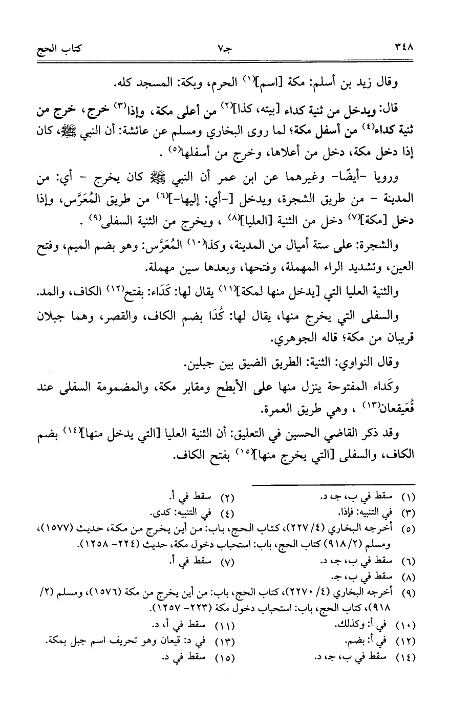 قال: ويدخل من ثنية كداء [بيته, كذا] من أعلى مكة, وإذا خرج, خرج من ثنية كداء من أسفل مكة؛ لما روى البخاري ومسلم عن عائشة: أن النبي- صلى الله عليه وسلم-, كان إذا دخل مكة, دخل من أعلاها, وخرج من أسفلها.