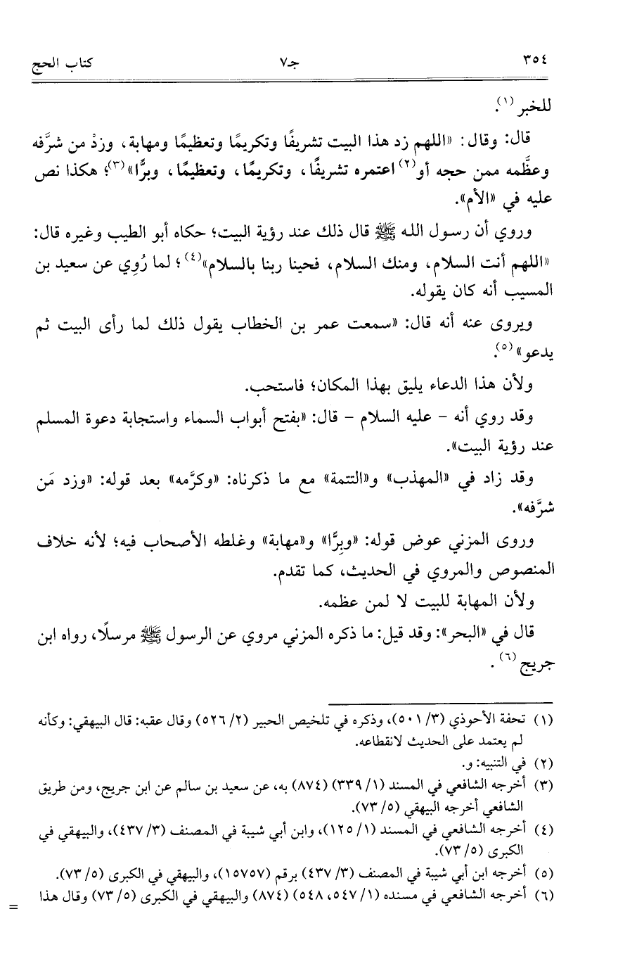 قال: وقال: "اللهم زد هذا البيت، تشريفاً وتكريما وتعظيماً ومهابة، وزدْ من شرَّفه وعظَّمه ممن حجه أو اعتمره تشريفاً، وتكريماً، وتعظيماً، وبرًّا"؛ هكذا نص عليه في "الأم".