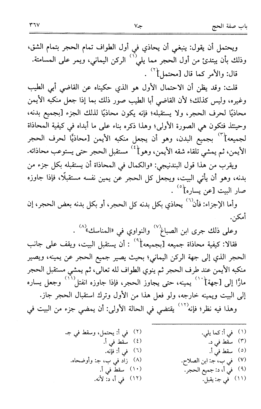 ويقرب من هذا قول البندنيجي: "والكمال في المحاذاة أن يستقبله بكل جزء من بدنه، وهو أن يأتي البيت، ويجعل كل الحجر عن يمين نفسه مستقبلاً، فإذا جاوزه صار البييت [عن يساره].