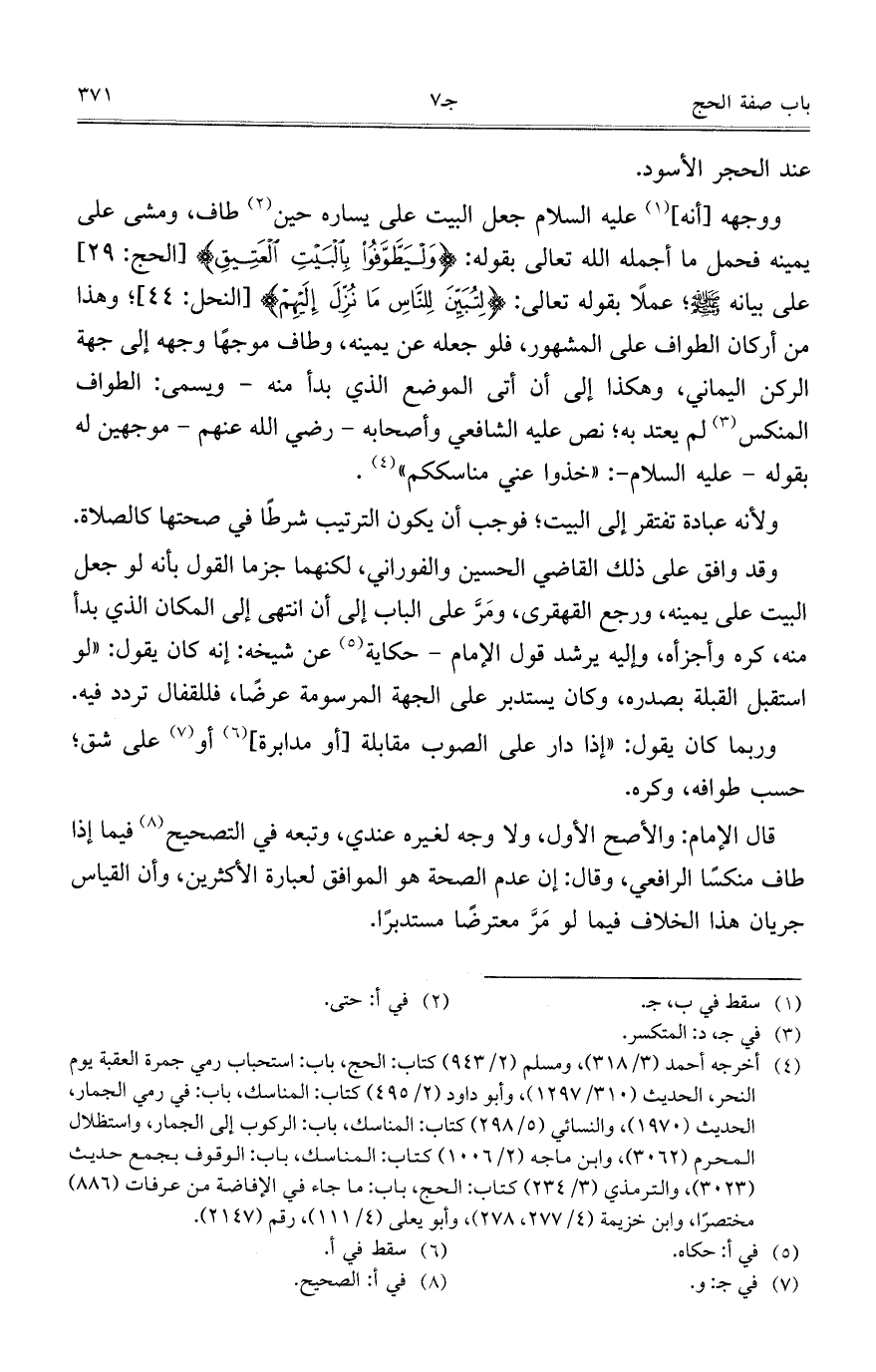 ووجهه [أنه] عليه السلام جعل البيت على يساره حين طاف، ومشى على يمينه فحمل ما أجمله الله تعالى بقوله: {وَلْيَطَّوَّفُوا بِالْبَيْتِ الْعَتِيقِ} [الحج: 29] على بيانه صلى الله عليه وسلم؛ عملاً يقوله تعالى: {لِتُبَيِّنَ لِلنَّاسِ مَا نُزِّلَ إِلَيْهِمْ} [النحل: 44]؛ وهذا من أركان الطواف على المشهور، فلو جعله عن يمينه، وطاف موجها وجهه إلى جهة الركن اليماني، وهكذا إلى أن أتى الموضع الذي بدأ منه - ويسمى: الطواف المنكس لم يعتد به؛ نص عليه الشافعي وأصحابه - رضي الله عنهم - موجهين له بقوله - عليه السلام-: "خذوا عني مناسككم".